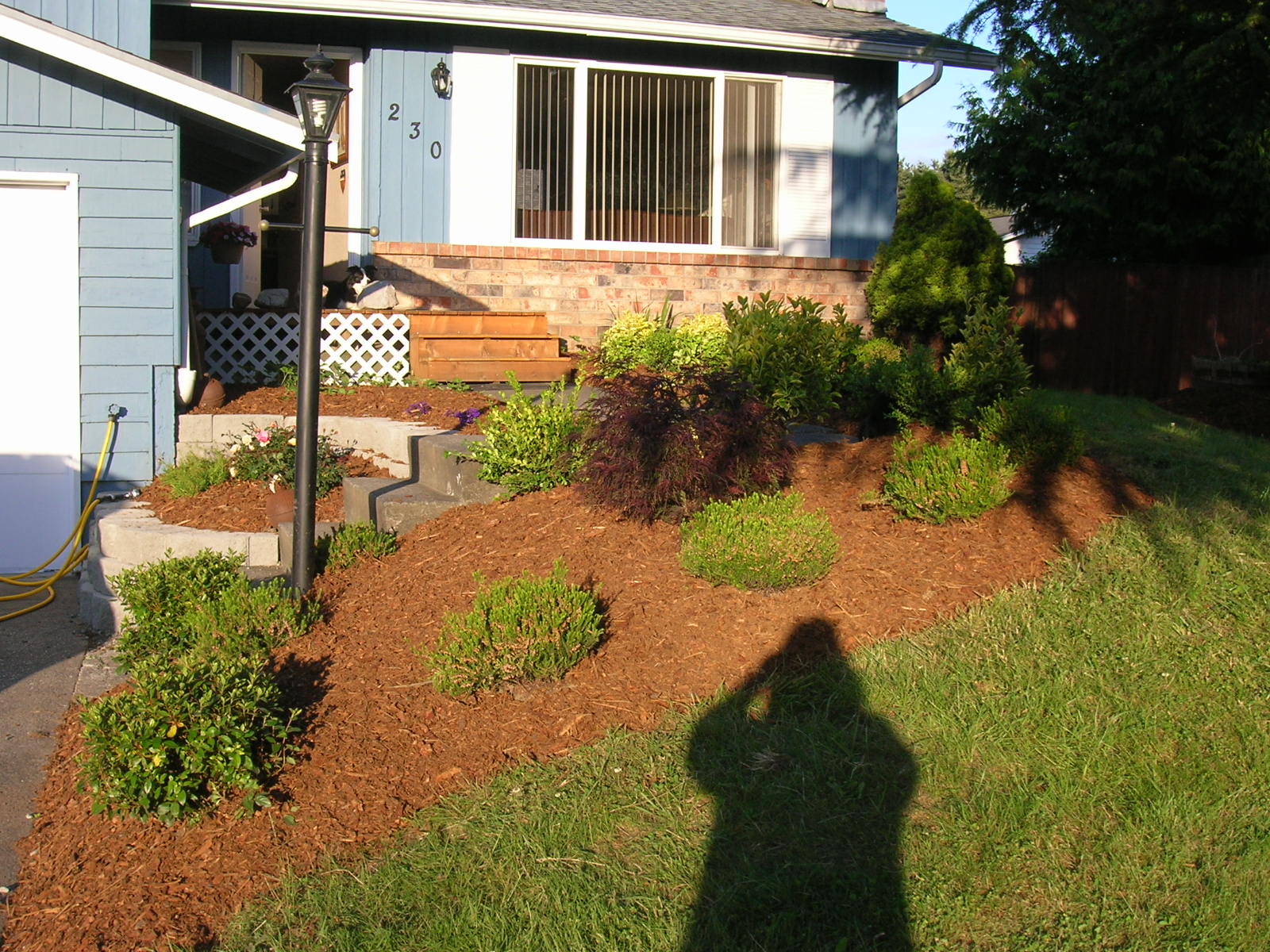 Before....nice dirt patch where people walked off the path instead of using the stairs. Plus very hard to mow this as it's quite steep and there is a lamp post smack in the middle.