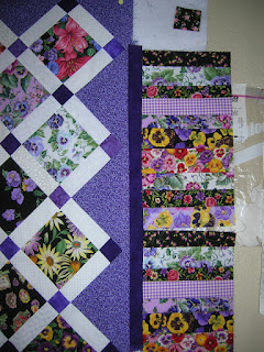 And since I had a few blocks left over, I whipped up a table runner. I'll bind this in the purple that the setting triangles are pieced with if there is enough left over from the quilt. This will make a pretty gift when someone needs a little cheering up.