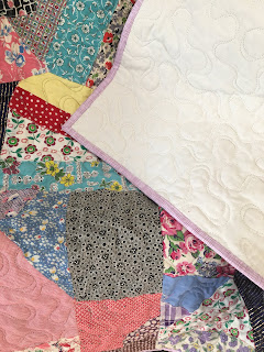 A simple ribbon motif did the trick for quilting. I really loved getting close up to so many fabrics from days gone by. Plaids mixed with stripes stitched to dots and florals. It's all good!